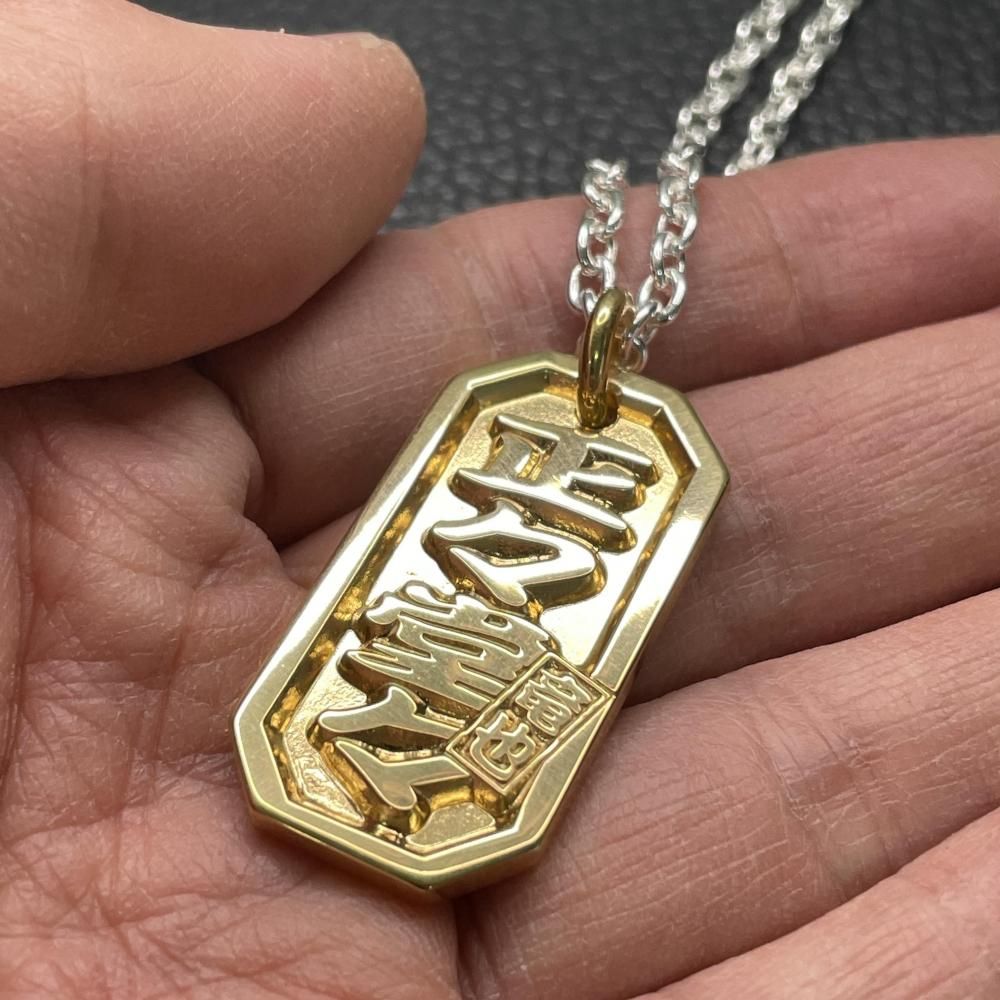 62,700円(税込)『家紋部分に指定させていただいたオリジナルのロゴが綺麗に再現されており、それどころかむしろこちらが出した元の画像より美しく仕上がっており大満足です! 金メッキもよくある安っぽい感じではなく、高級感のある仕上がりでとても綺麗です。 大きさも大きすぎず小さすぎず、存在感がありながらも邪魔にはならないのでとても丁度良いです。 力強いネックレスが欲しくて威圧感のある名前で依頼をしたので、それと八角喧嘩札の力強さと金メッキの高級感の相性が抜群で注文して本当に良かったです!! !』 -