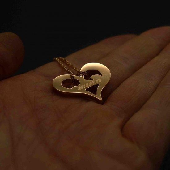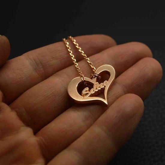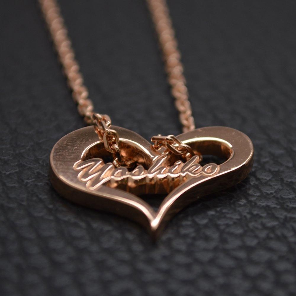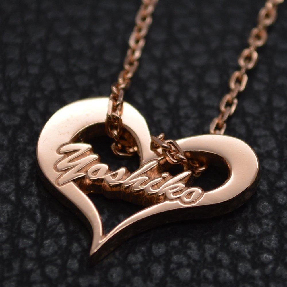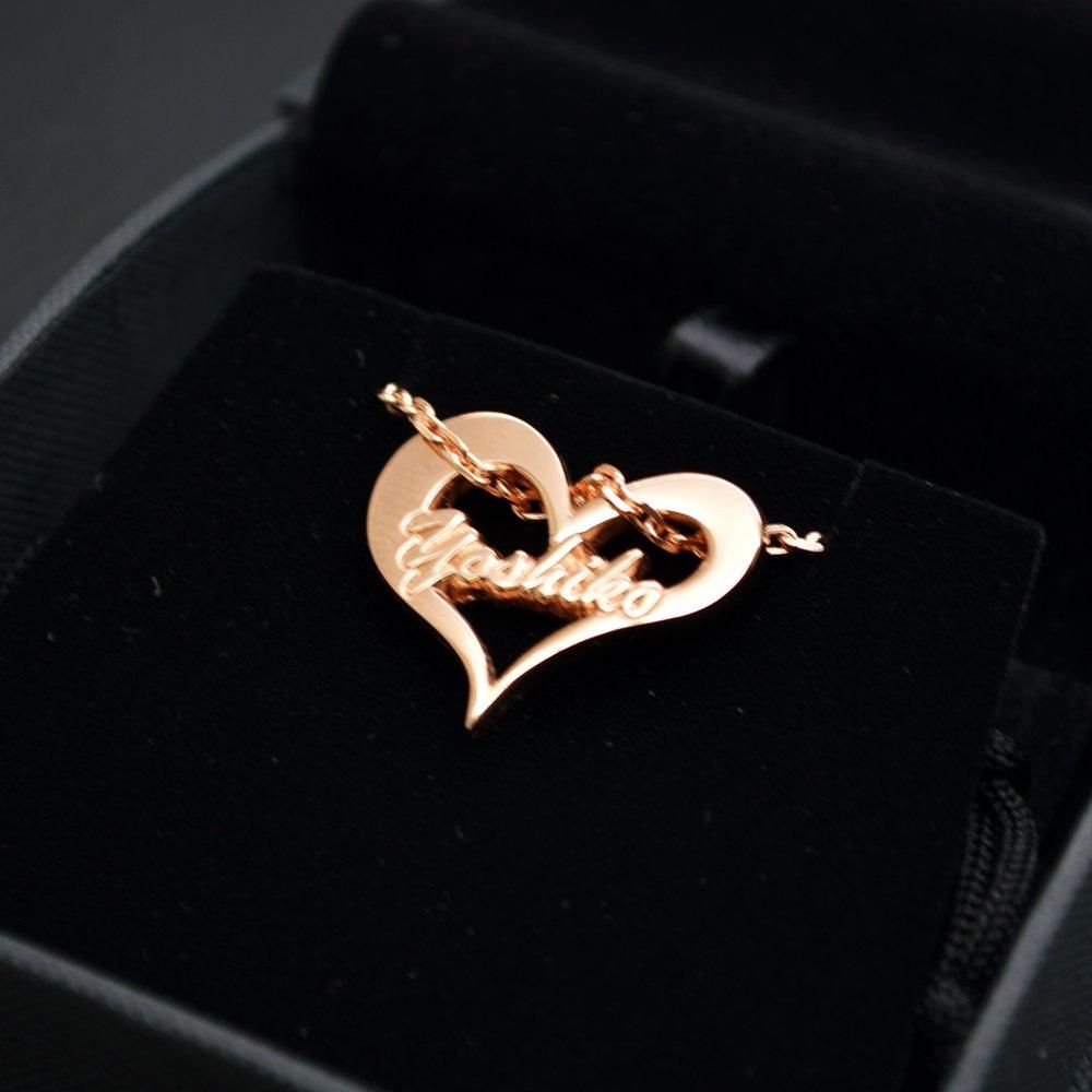 他店にはない自慢の「厚み」が人気の当店のオリジナルネームネックレスに、数十種類のデッサンから厳選したハートマークを枠に使用しました。 いいとこ取りのデザインが女性のココロを掴んでいます。世の男性諸氏にも自信を持ってオススメします。